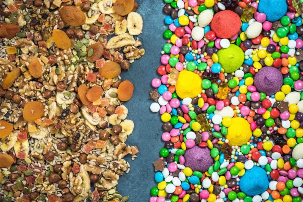 Junk food and sweets contra dried healthy snacks. Dieting and heatlhy eating choices concept.